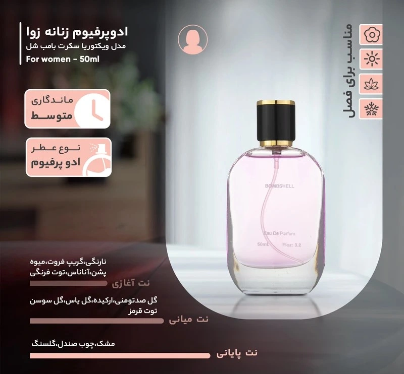 ویژگی‌های ادوپرفیوم زنانه زوا مدل ویکتوریا سکرت بامب شل – حجم 50 میلی‌لیتر